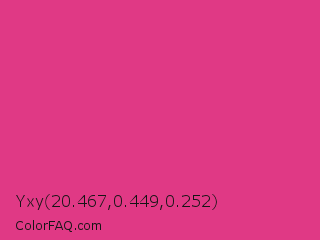 Yxy 20.467,0.449,0.252 Color is a normal rose color and the nearest color is Cerise #da3287. Hex code #e03985 and RGB value is rgb(224,57,133). In RGB color space, this color is composed of 88% red, 22% green, 52% blue, In CMYK color space, this color is composed of 0% cyan, 75% magenta, 41% yellow , 12% black , In HSL color space, this color has a hue angle of 333° , 73% saturation and 55% lightness.