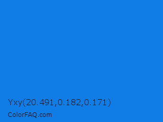 Yxy 20.491,0.182,0.171 Color is a normal blue color and the nearest color is Bright Navy Blue #1974d2. Hex code #107de6 and RGB value is rgb(16,125,230). In RGB color space, this color is composed of 6% red, 49% green, 90% blue, In CMYK color space, this color is composed of 93% cyan, 46% magenta, 0% yellow , 10% black , In HSL color space, this color has a hue angle of 209° , 87% saturation and 48% lightness.