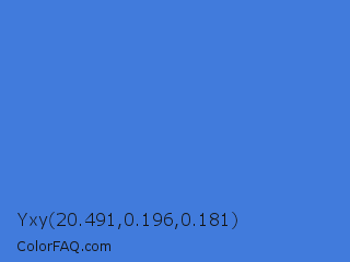 Yxy 20.491,0.196,0.181 Color is a normal blue color and the nearest color is Royal Blue #4169e1. Hex code #417bdc and RGB value is rgb(65,123,220). In RGB color space, this color is composed of 25% red, 48% green, 86% blue, In CMYK color space, this color is composed of 70% cyan, 44% magenta, 0% yellow , 14% black , In HSL color space, this color has a hue angle of 218° , 69% saturation and 56% lightness.