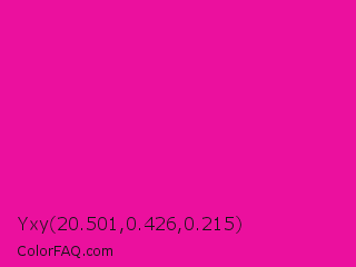 Yxy 20.501,0.426,0.215 Color is a normal magenta color and the nearest color is Hollywood Cerise #f400a1. Hex code #eb109e and RGB value is rgb(235,16,158). In RGB color space, this color is composed of 92% red, 6% green, 62% blue, In CMYK color space, this color is composed of 0% cyan, 93% magenta, 33% yellow , 8% black , In HSL color space, this color has a hue angle of 321° , 87% saturation and 49% lightness.