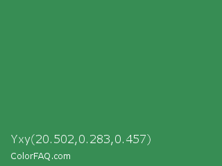 Yxy 20.502,0.283,0.457 Color is a normal green color and the nearest color is Sea Green #2e8b57. Hex code #378d54 and RGB value is rgb(55,141,84). In RGB color space, this color is composed of 22% red, 55% green, 33% blue, In CMYK color space, this color is composed of 61% cyan, 0% magenta, 40% yellow , 45% black , In HSL color space, this color has a hue angle of 140° , 44% saturation and 38% lightness.