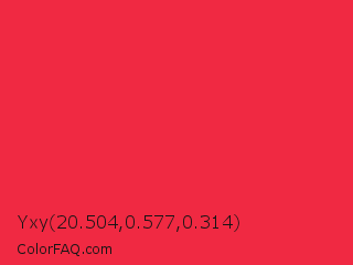 Yxy 20.504,0.577,0.314 Color is a normal red color and the nearest color is Imperial Red #ed2939. Hex code #f02942 and RGB value is rgb(240,41,66). In RGB color space, this color is composed of 94% red, 16% green, 26% blue, In CMYK color space, this color is composed of 0% cyan, 83% magenta, 73% yellow , 6% black , In HSL color space, this color has a hue angle of 352° , 87% saturation and 55% lightness.