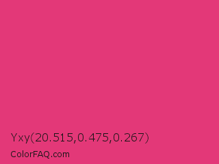Yxy 20.515,0.475,0.267 Color is a normal rose color and the nearest color is Cerise Pink #ec3b83. Hex code #e33878 and RGB value is rgb(227,56,120). In RGB color space, this color is composed of 89% red, 22% green, 47% blue, In CMYK color space, this color is composed of 0% cyan, 75% magenta, 47% yellow , 11% black , In HSL color space, this color has a hue angle of 338° , 75% saturation and 55% lightness.