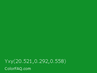 Yxy 20.521,0.292,0.558 Color is a normal green color and the nearest color is North Texas Green #059033. Hex code #109129 and RGB value is rgb(16,145,41). In RGB color space, this color is composed of 6% red, 57% green, 16% blue, In CMYK color space, this color is composed of 89% cyan, 0% magenta, 72% yellow , 43% black , In HSL color space, this color has a hue angle of 132° , 80% saturation and 32% lightness.
