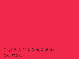 Yxy 20.524,0.568,0.308 Color is a normal red color and the nearest color is Red Crayola #ee204d. Hex code #f02849 and RGB value is rgb(240,40,73). In RGB color space, this color is composed of 94% red, 16% green, 29% blue, In CMYK color space, this color is composed of 0% cyan, 83% magenta, 70% yellow , 6% black , In HSL color space, this color has a hue angle of 350° , 87% saturation and 55% lightness.