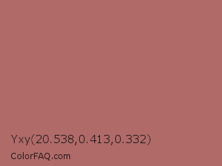Yxy 20.538,0.413,0.332 Color is a normal red color and the nearest color is Copper Penny #ad6f69. Hex code #b06a68 and RGB value is rgb(176,106,104). In RGB color space, this color is composed of 69% red, 42% green, 41% blue, In CMYK color space, this color is composed of 0% cyan, 40% magenta, 41% yellow , 31% black , In HSL color space, this color has a hue angle of 2° , 31% saturation and 55% lightness.