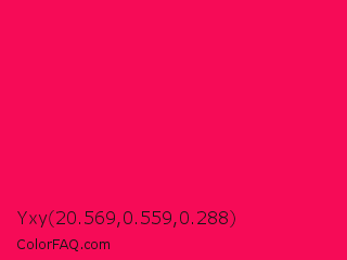 Yxy 20.569,0.559,0.288 Color is a normal rose color and the nearest color is Folly #ff004f. Hex code #f60b57 and RGB value is rgb(246,11,87). In RGB color space, this color is composed of 96% red, 4% green, 34% blue, In CMYK color space, this color is composed of 0% cyan, 96% magenta, 65% yellow , 4% black , In HSL color space, this color has a hue angle of 341° , 93% saturation and 50% lightness.