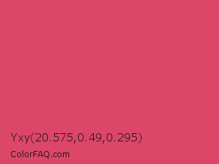 Yxy 20.575,0.49,0.295 Color is a normal red color and the nearest color is Cabaret #d94972. Hex code #dc4667 and RGB value is rgb(220,70,103). In RGB color space, this color is composed of 86% red, 27% green, 40% blue, In CMYK color space, this color is composed of 0% cyan, 68% magenta, 53% yellow , 14% black , In HSL color space, this color has a hue angle of 347° , 68% saturation and 57% lightness.