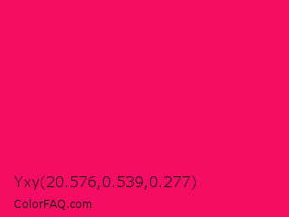 Yxy 20.576,0.539,0.277 Color is a normal rose color and the nearest color is Vivid Raspberry #ff006c. Hex code #f50c63 and RGB value is rgb(245,12,99). In RGB color space, this color is composed of 96% red, 5% green, 39% blue, In CMYK color space, this color is composed of 0% cyan, 95% magenta, 60% yellow , 4% black , In HSL color space, this color has a hue angle of 338° , 92% saturation and 50% lightness.