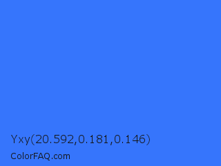 Yxy 20.592,0.181,0.146 Color is a normal blue color and the nearest color is Ultramarine Blue #4166f5. Hex code #3675fc and RGB value is rgb(54,117,252). In RGB color space, this color is composed of 21% red, 46% green, 99% blue, In CMYK color space, this color is composed of 79% cyan, 54% magenta, 0% yellow , 1% black , In HSL color space, this color has a hue angle of 221° , 97% saturation and 60% lightness.