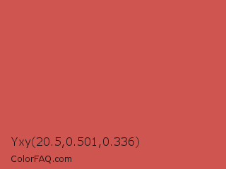 Yxy 20.5,0.501,0.336 Color is a normal red color and the nearest color is Cedar Chest #c95a49. Hex code #cf5650 and RGB value is rgb(207,86,80). In RGB color space, this color is composed of 81% red, 34% green, 31% blue, In CMYK color space, this color is composed of 0% cyan, 58% magenta, 61% yellow , 19% black , In HSL color space, this color has a hue angle of 3° , 57% saturation and 56% lightness.