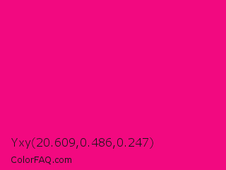 Yxy 20.609,0.486,0.247 Color is a normal rose color and the nearest color is Rose #ff007f. Hex code #f20980 and RGB value is rgb(242,9,128). In RGB color space, this color is composed of 95% red, 4% green, 50% blue, In CMYK color space, this color is composed of 0% cyan, 96% magenta, 47% yellow , 5% black , In HSL color space, this color has a hue angle of 329° , 93% saturation and 49% lightness.