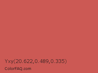 Yxy 20.622,0.489,0.335 Color is a normal red color and the nearest color is Fuzzy Wuzzy Brown #c45655. Hex code #cc5954 and RGB value is rgb(204,89,84). In RGB color space, this color is composed of 80% red, 35% green, 33% blue, In CMYK color space, this color is composed of 0% cyan, 56% magenta, 59% yellow , 20% black , In HSL color space, this color has a hue angle of 3° , 54% saturation and 56% lightness.