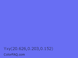 Yxy 20.626,0.203,0.152 Color is a light blue color and the nearest color is Very Light Blue #6666ff. Hex code #686ef3 and RGB value is rgb(104,110,243). In RGB color space, this color is composed of 41% red, 43% green, 95% blue, In CMYK color space, this color is composed of 57% cyan, 55% magenta, 0% yellow , 5% black , In HSL color space, this color has a hue angle of 237° , 85% saturation and 68% lightness.