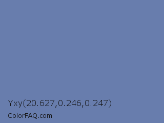 Yxy 20.627,0.246,0.247 Color is a normal blue color and the nearest color is Glaucous #6082b6. Hex code #687dad and RGB value is rgb(104,125,173). In RGB color space, this color is composed of 41% red, 49% green, 68% blue, In CMYK color space, this color is composed of 40% cyan, 28% magenta, 0% yellow , 32% black , In HSL color space, this color has a hue angle of 222° , 30% saturation and 54% lightness.