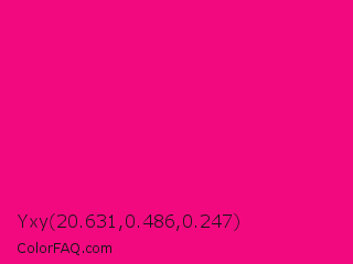 Yxy 20.631,0.486,0.247 Color is a normal rose color and the nearest color is Rose #ff007f. Hex code #f20980 and RGB value is rgb(242,9,128). In RGB color space, this color is composed of 95% red, 4% green, 50% blue, In CMYK color space, this color is composed of 0% cyan, 96% magenta, 47% yellow , 5% black , In HSL color space, this color has a hue angle of 329° , 93% saturation and 49% lightness.