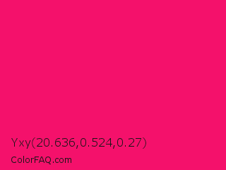 Yxy 20.636,0.524,0.27 Color is a normal rose color and the nearest color is Vivid Raspberry #ff006c. Hex code #f4116b and RGB value is rgb(244,17,107). In RGB color space, this color is composed of 96% red, 7% green, 42% blue, In CMYK color space, this color is composed of 0% cyan, 93% magenta, 56% yellow , 4% black , In HSL color space, this color has a hue angle of 336° , 91% saturation and 51% lightness.