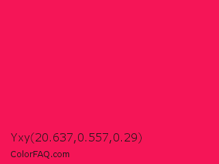 Yxy 20.637,0.557,0.29 Color is a normal rose color and the nearest color is Awesome #ff2052. Hex code #f51557 and RGB value is rgb(245,21,87). In RGB color space, this color is composed of 96% red, 8% green, 34% blue, In CMYK color space, this color is composed of 0% cyan, 91% magenta, 64% yellow , 4% black , In HSL color space, this color has a hue angle of 342° , 92% saturation and 52% lightness.