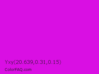 Yxy 20.639,0.31,0.15 Color is a normal magenta color and the nearest color is Deep Magenta #cc00cc. Hex code #d90fe3 and RGB value is rgb(217,15,227). In RGB color space, this color is composed of 85% red, 6% green, 89% blue, In CMYK color space, this color is composed of 4% cyan, 93% magenta, 0% yellow , 11% black , In HSL color space, this color has a hue angle of 297° , 88% saturation and 47% lightness.