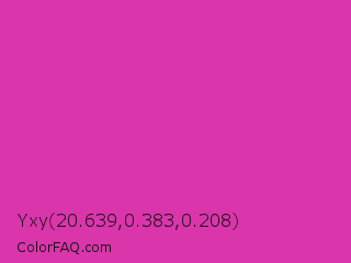 Yxy 20.639,0.383,0.208 Color is a normal magenta color and the nearest color is Frostbite #e936a7. Hex code #db35ab and RGB value is rgb(219,53,171). In RGB color space, this color is composed of 86% red, 21% green, 67% blue, In CMYK color space, this color is composed of 0% cyan, 76% magenta, 22% yellow , 14% black , In HSL color space, this color has a hue angle of 317° , 70% saturation and 53% lightness.