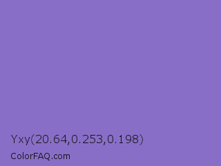 Yxy 20.64,0.253,0.198 Color is a light indigo color and the nearest color is Middle Blue Purple #8b72be. Hex code #896ec8 and RGB value is rgb(137,110,200). In RGB color space, this color is composed of 54% red, 43% green, 78% blue, In CMYK color space, this color is composed of 32% cyan, 45% magenta, 0% yellow , 22% black , In HSL color space, this color has a hue angle of 258° , 45% saturation and 61% lightness.