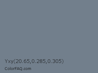 Yxy 20.65,0.285,0.305 Color is a normal blue color and the nearest color is Slate Gray #708090. Hex code #727f8c and RGB value is rgb(114,127,140). In RGB color space, this color is composed of 45% red, 50% green, 55% blue, In CMYK color space, this color is composed of 19% cyan, 9% magenta, 0% yellow , 45% black , In HSL color space, this color has a hue angle of 210° , 10% saturation and 50% lightness.