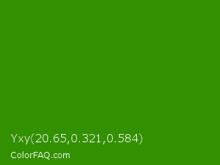 Yxy 20.65,0.321,0.584 Color is a dark green color and the nearest color is Napier Green #2a8000. Hex code #339000 and RGB value is rgb(51,144,0). In RGB color space, this color is composed of 20% red, 56% green, 0% blue, In CMYK color space, this color is composed of 65% cyan, 0% magenta, 100% yellow , 44% black , In HSL color space, this color has a hue angle of 99° , 100% saturation and 28% lightness.
