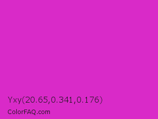 Yxy 20.65,0.341,0.176 Color is a normal magenta color and the nearest color is Steel Pink #cc33cc. Hex code #d92ac8 and RGB value is rgb(217,42,200). In RGB color space, this color is composed of 85% red, 16% green, 78% blue, In CMYK color space, this color is composed of 0% cyan, 81% magenta, 8% yellow , 15% black , In HSL color space, this color has a hue angle of 306° , 70% saturation and 51% lightness.