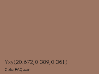 Yxy 20.672,0.389,0.361 Color is a normal orange color and the nearest color is Toast #9a6e61. Hex code #9c7562 and RGB value is rgb(156,117,98). In RGB color space, this color is composed of 61% red, 46% green, 38% blue, In CMYK color space, this color is composed of 0% cyan, 25% magenta, 37% yellow , 39% black , In HSL color space, this color has a hue angle of 20° , 23% saturation and 50% lightness.