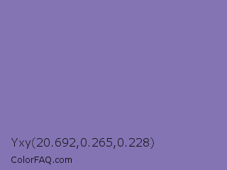 Yxy 20.692,0.265,0.228 Color is a normal indigo color and the nearest color is Middle Blue Purple #8b72be. Hex code #8474b4 and RGB value is rgb(132,116,180). In RGB color space, this color is composed of 52% red, 45% green, 71% blue, In CMYK color space, this color is composed of 27% cyan, 36% magenta, 0% yellow , 29% black , In HSL color space, this color has a hue angle of 255° , 30% saturation and 58% lightness.