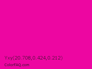 Yxy 20.708,0.424,0.212 Color is a normal magenta color and the nearest color is Hollywood Cerise #f400a1. Hex code #ed06a1 and RGB value is rgb(237,6,161). In RGB color space, this color is composed of 93% red, 2% green, 63% blue, In CMYK color space, this color is composed of 0% cyan, 97% magenta, 32% yellow , 7% black , In HSL color space, this color has a hue angle of 320° , 95% saturation and 48% lightness.