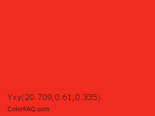 Yxy 20.709,0.61,0.335 Color is a normal red color and the nearest color is Lust #e62020. Hex code #f22b20 and RGB value is rgb(242,43,32). In RGB color space, this color is composed of 95% red, 17% green, 13% blue, In CMYK color space, this color is composed of 0% cyan, 82% magenta, 87% yellow , 5% black , In HSL color space, this color has a hue angle of 3° , 89% saturation and 54% lightness.