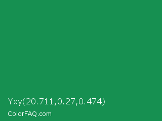 Yxy 20.711,0.27,0.474 Color is a normal green color and the nearest color is Eucalyptus #278a5b. Hex code #169051 and RGB value is rgb(22,144,81). In RGB color space, this color is composed of 9% red, 56% green, 32% blue, In CMYK color space, this color is composed of 85% cyan, 0% magenta, 44% yellow , 44% black , In HSL color space, this color has a hue angle of 149° , 73% saturation and 33% lightness.