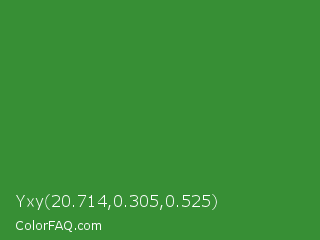 Yxy 20.714,0.305,0.525 Color is a normal green color and the nearest color is May Green #4c9141. Hex code #378f35 and RGB value is rgb(55,143,53). In RGB color space, this color is composed of 22% red, 56% green, 21% blue, In CMYK color space, this color is composed of 62% cyan, 0% magenta, 63% yellow , 44% black , In HSL color space, this color has a hue angle of 119° , 46% saturation and 38% lightness.