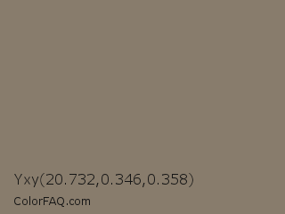 Yxy 20.732,0.346,0.358 Color is a normal orange color and the nearest color is Makara #897d6d. Hex code #887c6c and RGB value is rgb(136,124,108). In RGB color space, this color is composed of 53% red, 49% green, 42% blue, In CMYK color space, this color is composed of 0% cyan, 9% magenta, 21% yellow , 47% black , In HSL color space, this color has a hue angle of 34° , 11% saturation and 48% lightness.