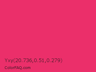 Yxy 20.736,0.51,0.279 Color is a normal rose color and the nearest color is Razzmatazz #e3256b. Hex code #eb2f6a and RGB value is rgb(235,47,106). In RGB color space, this color is composed of 92% red, 18% green, 42% blue, In CMYK color space, this color is composed of 0% cyan, 80% magenta, 55% yellow , 8% black , In HSL color space, this color has a hue angle of 341° , 82% saturation and 55% lightness.