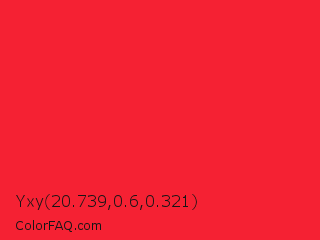 Yxy 20.739,0.6,0.321 Color is a normal red color and the nearest color is Imperial Red #ed2939. Hex code #f52133 and RGB value is rgb(245,33,51). In RGB color space, this color is composed of 96% red, 13% green, 20% blue, In CMYK color space, this color is composed of 0% cyan, 87% magenta, 79% yellow , 4% black , In HSL color space, this color has a hue angle of 355° , 91% saturation and 55% lightness.