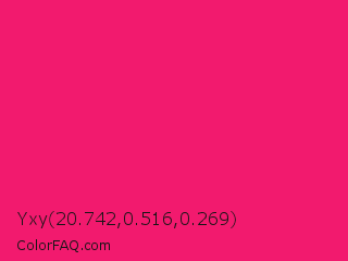 Yxy 20.742,0.516,0.269 Color is a normal rose color and the nearest color is Razzmatazz #e3256b. Hex code #f21a6e and RGB value is rgb(242,26,110). In RGB color space, this color is composed of 95% red, 10% green, 43% blue, In CMYK color space, this color is composed of 0% cyan, 89% magenta, 55% yellow , 5% black , In HSL color space, this color has a hue angle of 337° , 89% saturation and 53% lightness.