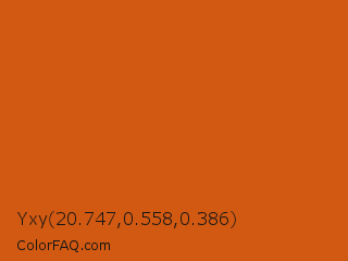 Yxy 20.747,0.558,0.386 Color is a normal orange color and the nearest color is Orange Roughy #c45719. Hex code #d15912 and RGB value is rgb(209,89,18). In RGB color space, this color is composed of 82% red, 35% green, 7% blue, In CMYK color space, this color is composed of 0% cyan, 57% magenta, 91% yellow , 18% black , In HSL color space, this color has a hue angle of 22° , 84% saturation and 45% lightness.