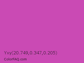 Yxy 20.749,0.347,0.205 Color is a normal magenta color and the nearest color is Fuchsia Pink #c154c1. Hex code #ca4ab4 and RGB value is rgb(202,74,180). In RGB color space, this color is composed of 79% red, 29% green, 71% blue, In CMYK color space, this color is composed of 0% cyan, 63% magenta, 11% yellow , 21% black , In HSL color space, this color has a hue angle of 310° , 55% saturation and 54% lightness.