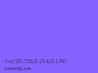 Yxy 20.756,0.214,0.139 Color is a light indigo color and the nearest color is Medium Slate Blue #7b68ee. Hex code #8561ff and RGB value is rgb(133,97,255). In RGB color space, this color is composed of 52% red, 38% green, 100% blue, In CMYK color space, this color is composed of 48% cyan, 62% magenta, 0% yellow , 0% black , In HSL color space, this color has a hue angle of 254° , 100% saturation and 69% lightness.