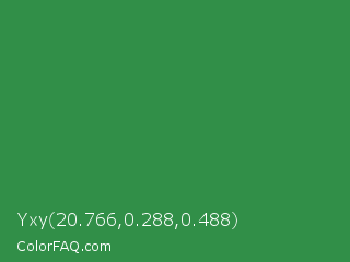 Yxy 20.766,0.288,0.488 Color is a normal green color and the nearest color is Sea Green #2e8b57. Hex code #318f48 and RGB value is rgb(49,143,72). In RGB color space, this color is composed of 19% red, 56% green, 28% blue, In CMYK color space, this color is composed of 66% cyan, 0% magenta, 50% yellow , 44% black , In HSL color space, this color has a hue angle of 135° , 49% saturation and 38% lightness.