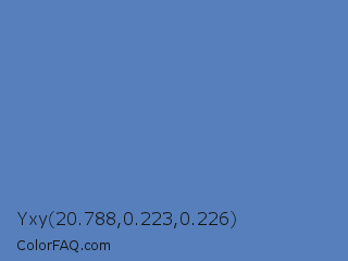 Yxy 20.788,0.223,0.226 Color is a normal blue color and the nearest color is Cyan Azure #4e82b4. Hex code #567fbc and RGB value is rgb(86,127,188). In RGB color space, this color is composed of 34% red, 50% green, 74% blue, In CMYK color space, this color is composed of 54% cyan, 32% magenta, 0% yellow , 26% black , In HSL color space, this color has a hue angle of 216° , 43% saturation and 54% lightness.