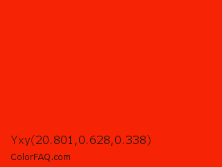Yxy 20.801,0.628,0.338 Color is a normal red color and the nearest color is Scarlet #ff2400. Hex code #f62304 and RGB value is rgb(246,35,4). In RGB color space, this color is composed of 96% red, 14% green, 2% blue, In CMYK color space, this color is composed of 0% cyan, 86% magenta, 98% yellow , 4% black , In HSL color space, this color has a hue angle of 8° , 97% saturation and 49% lightness.
