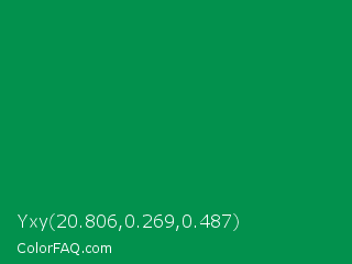 Yxy 20.806,0.269,0.487 Color is a dark green color and the nearest color is Spanish Green #009150. Hex code #02914d and RGB value is rgb(2,145,77). In RGB color space, this color is composed of 1% red, 57% green, 30% blue, In CMYK color space, this color is composed of 99% cyan, 0% magenta, 47% yellow , 43% black , In HSL color space, this color has a hue angle of 151° , 97% saturation and 29% lightness.
