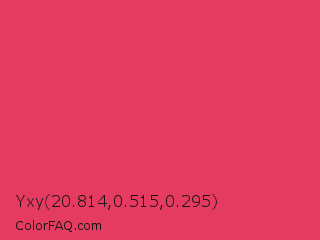 Yxy 20.814,0.515,0.295 Color is a normal red color and the nearest color is Paradise Pink #e63e62. Hex code #e63b61 and RGB value is rgb(230,59,97). In RGB color space, this color is composed of 90% red, 23% green, 38% blue, In CMYK color space, this color is composed of 0% cyan, 74% magenta, 58% yellow , 10% black , In HSL color space, this color has a hue angle of 347° , 77% saturation and 57% lightness.