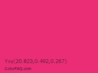Yxy 20.823,0.492,0.267 Color is a normal rose color and the nearest color is Razzmatazz #e3256b. Hex code #eb2d75 and RGB value is rgb(235,45,117). In RGB color space, this color is composed of 92% red, 18% green, 46% blue, In CMYK color space, this color is composed of 0% cyan, 81% magenta, 50% yellow , 8% black , In HSL color space, this color has a hue angle of 337° , 83% saturation and 55% lightness.