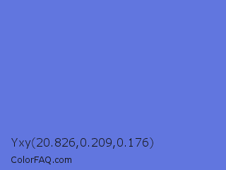 Yxy 20.826,0.209,0.176 Color is a light blue color and the nearest color is United Nations Blue #5b92e5. Hex code #6176df and RGB value is rgb(97,118,223). In RGB color space, this color is composed of 38% red, 46% green, 87% blue, In CMYK color space, this color is composed of 57% cyan, 47% magenta, 0% yellow , 13% black , In HSL color space, this color has a hue angle of 230° , 66% saturation and 63% lightness.