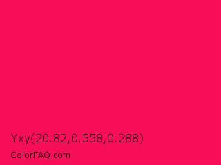 Yxy 20.82,0.558,0.288 Color is a normal rose color and the nearest color is Folly #ff004f. Hex code #f70e58 and RGB value is rgb(247,14,88). In RGB color space, this color is composed of 97% red, 5% green, 35% blue, In CMYK color space, this color is composed of 0% cyan, 94% magenta, 64% yellow , 3% black , In HSL color space, this color has a hue angle of 341° , 94% saturation and 51% lightness.