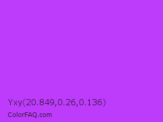 Yxy 20.849,0.26,0.136 Color is a light purple color and the nearest color is Veronica #a020f0. Hex code #bd3bfa and RGB value is rgb(189,59,250). In RGB color space, this color is composed of 74% red, 23% green, 98% blue, In CMYK color space, this color is composed of 24% cyan, 76% magenta, 0% yellow , 2% black , In HSL color space, this color has a hue angle of 281° , 95% saturation and 61% lightness.